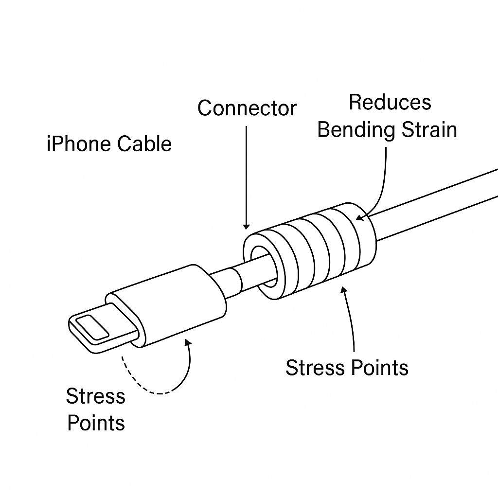 The iPhone Cable Protector. connector interface is subjected to concentrated bending forces that progressively weaken the insulation layers and internal conductors. TechRepairHub has demonstrated that common overnight charging behaviors introduce40% higher localized bending stress, accelerating fatigue and producing failure modes such as intermittent charging, exposed wiring, and ultimately inoperability.